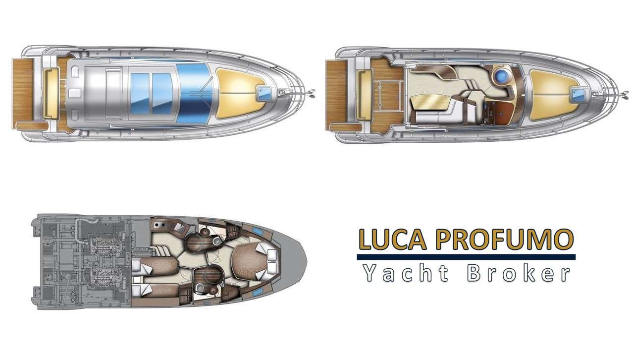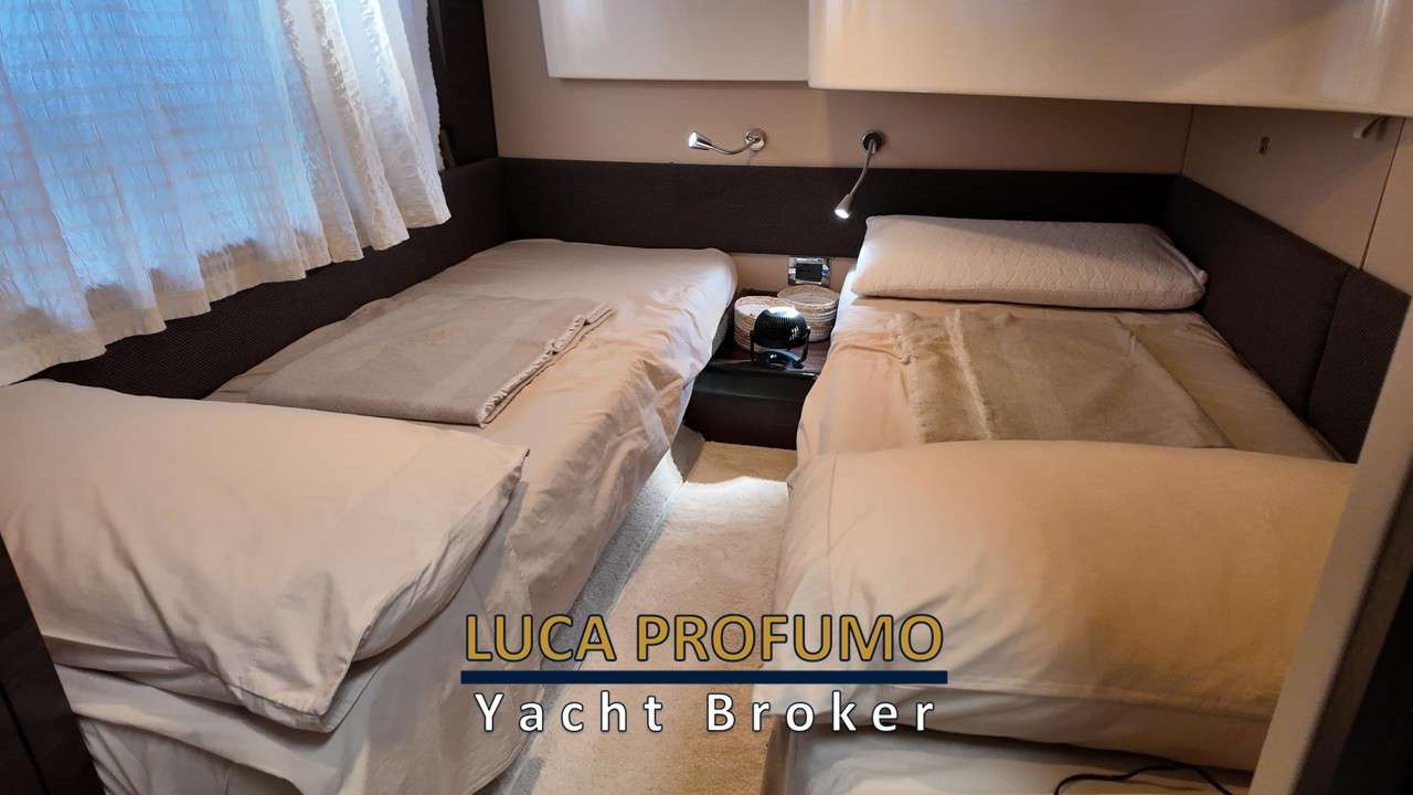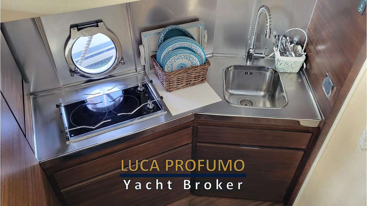 Salone capiente e raffinato ben illuminato. Chiusura porta scorrevole in acciaio e vetro. Cucina funzionale completa. Cabina armatoriale a prua con bagno. Cabina ospiti trasformabile matrimoniale/due letti in piano + bagno.