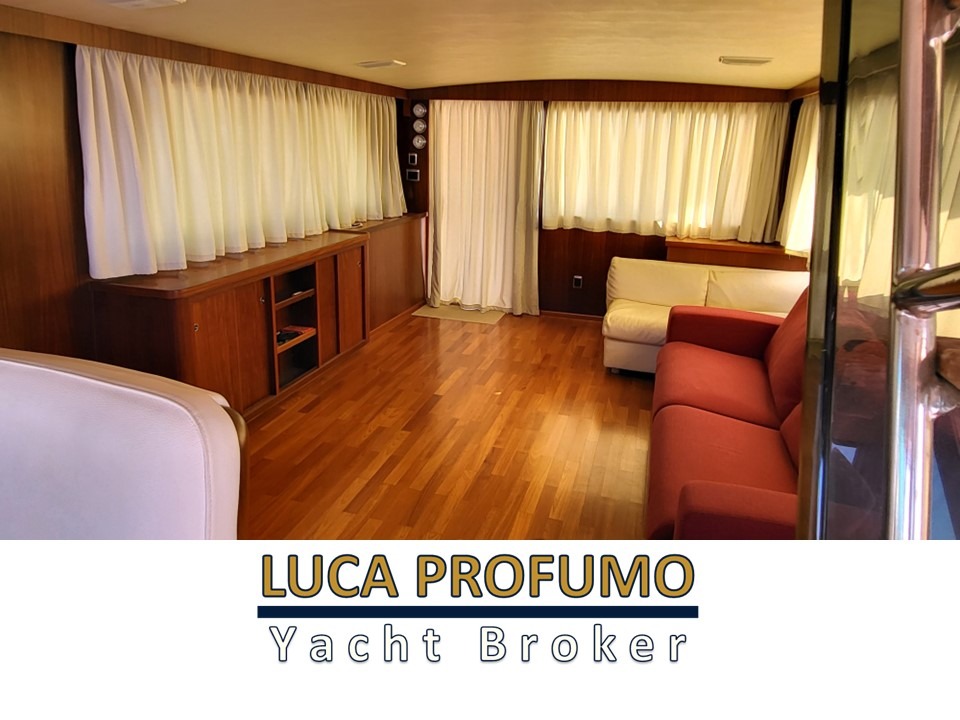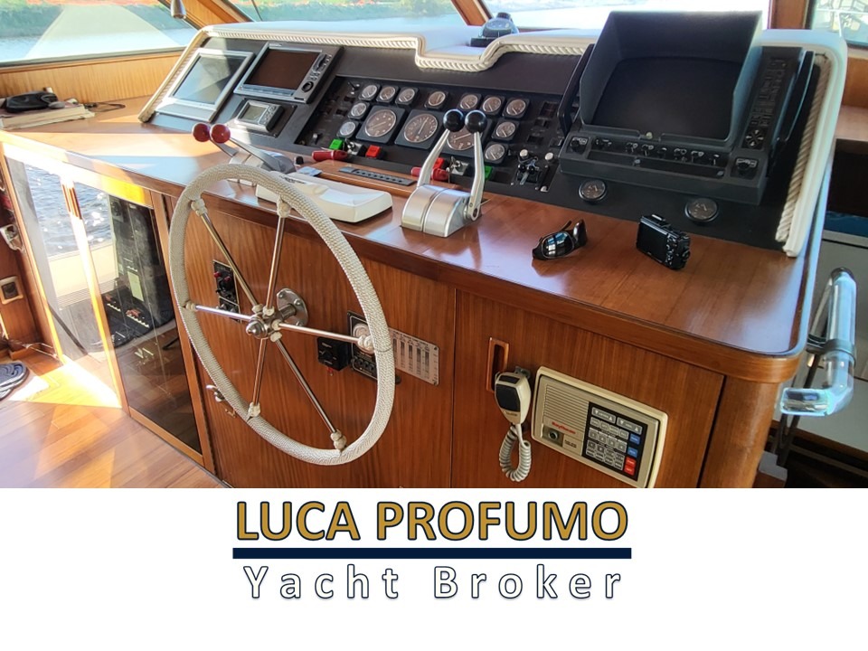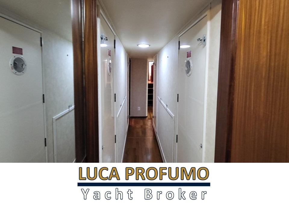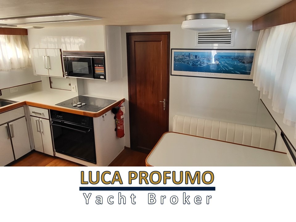 verricello ancora idraulico, due tonneggi elettrici a poppa, passerella idraulica, tendalino pozzetto fisso, Gruetta per tender, hard top con tendalini, Antenna TV SAT, TV a scomparsa nel salone, frigorifero doppio nel salone, Cucina completa di quattro fuochi elettrici, frigorifero, forno elettrico, microonde, cappa aspirante, lavastoviglie, lavasciuga.