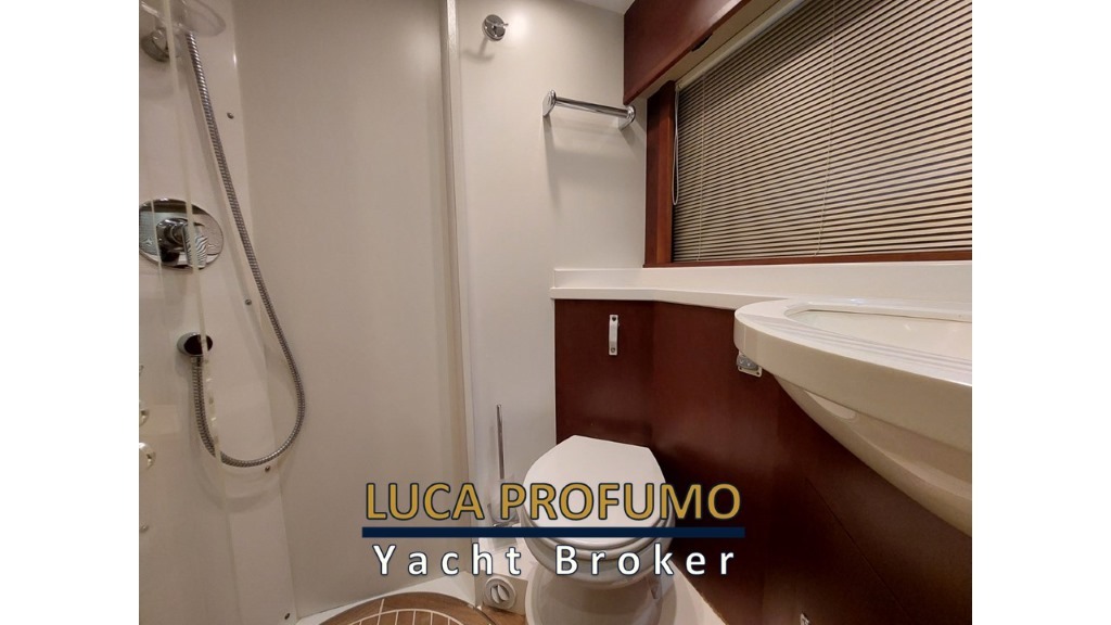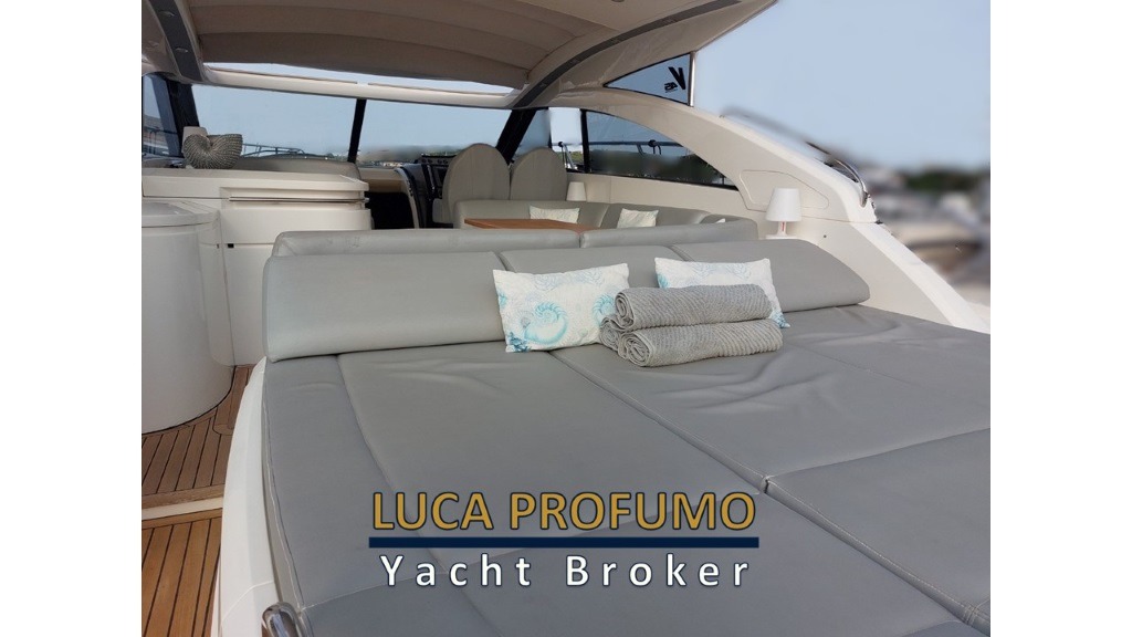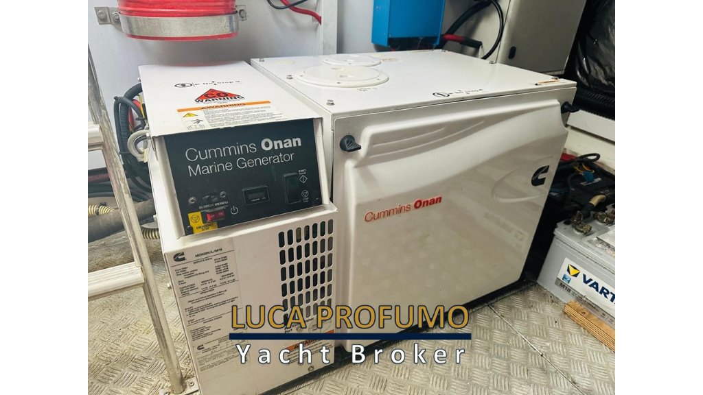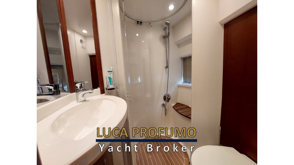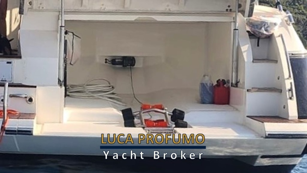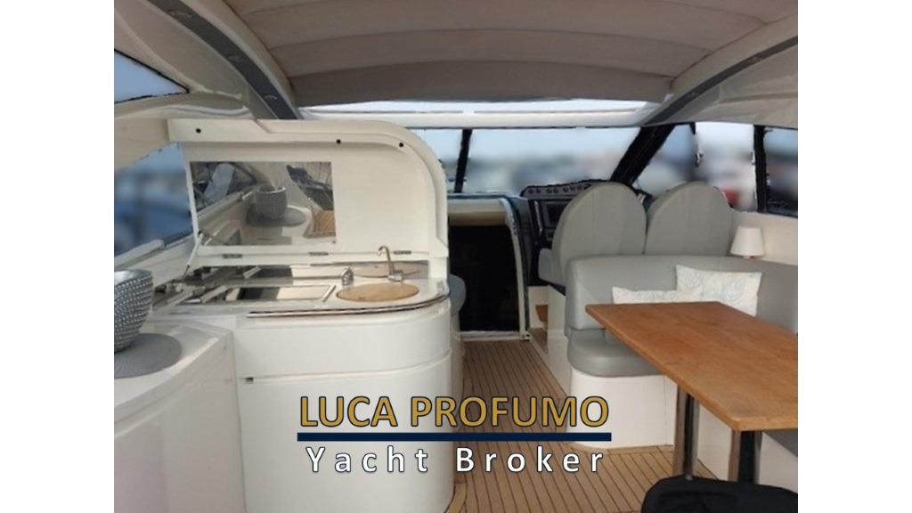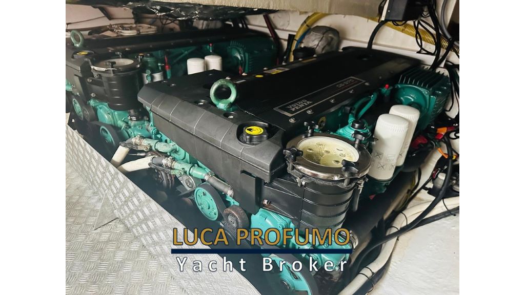 Passerella idraulica a scomparsa, Garage per tender con sistema di risalita, Elica di manovra a prua, Elica di manovra a poppa, Tettuccio apribile, Vetri laterali movimentazione elettrica, Intruder assetto automatico Volvo, Timoneria assistita, Ponte in teak, Pancetta in teak, Tendalino pozzetto, Cuscinerie coplete, Cuscini prendisole a prua.