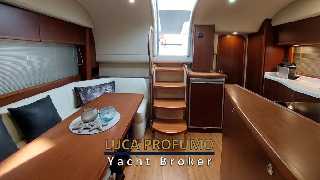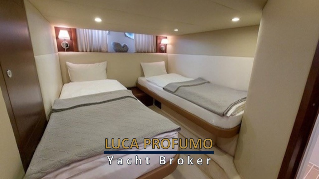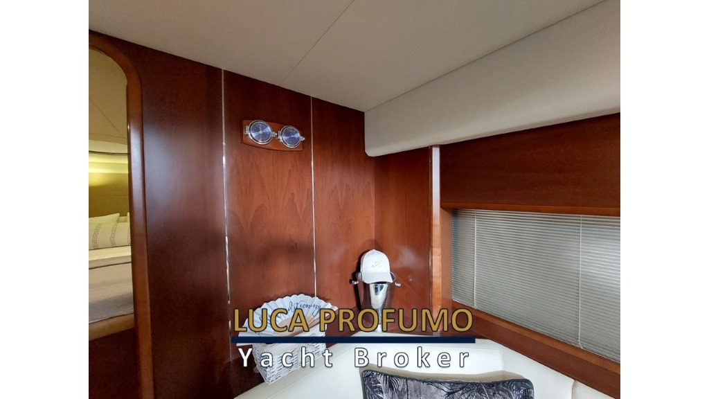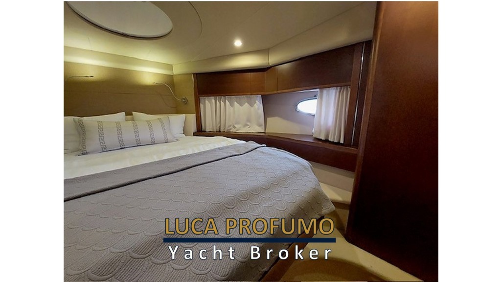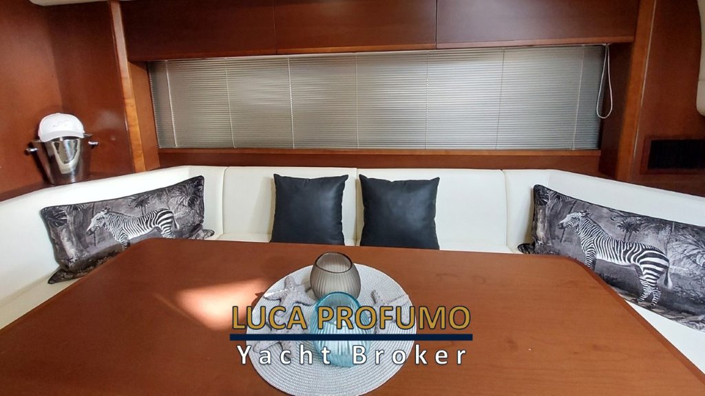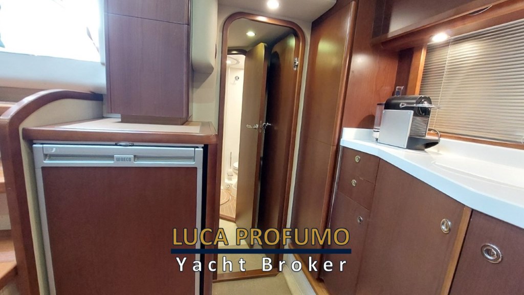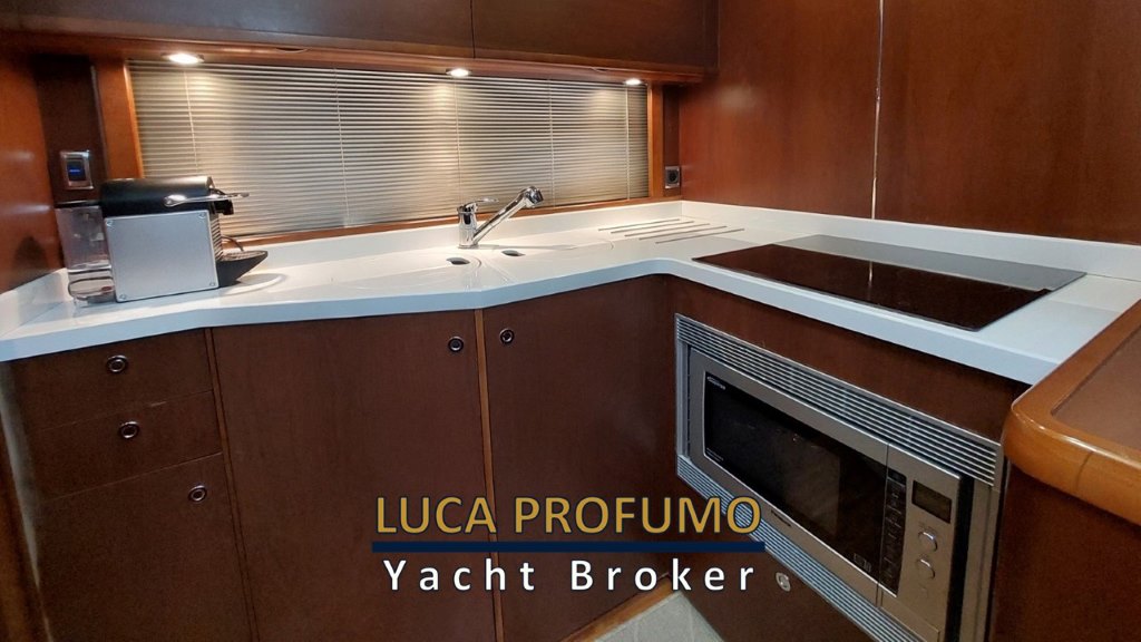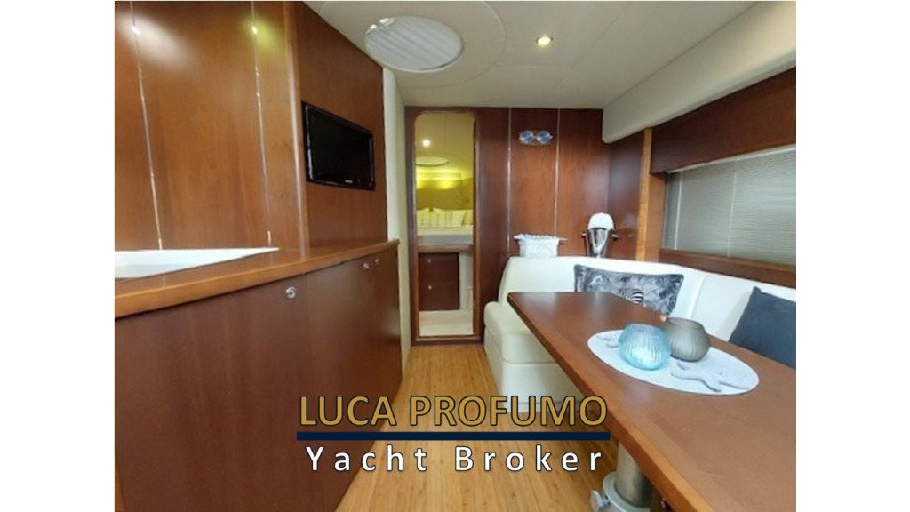 Passerella idraulica a scomparsa, Garage per tender con sistema di risalita, Elica di manovra a prua, Elica di manovra a poppa, Tettuccio apribile, Vetri laterali movimentazione elettrica, Intruder assetto automatico Volvo, Timoneria assistita, Ponte in teak, Pancetta in teak, Tendalino pozzetto, Cuscinerie coplete, Cuscini prendisole a prua.