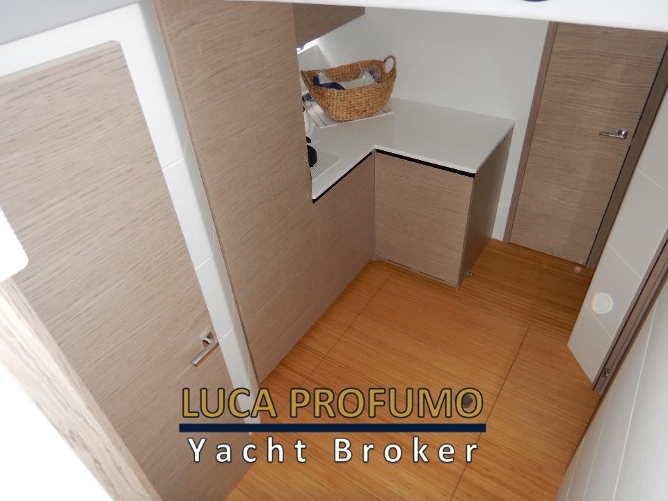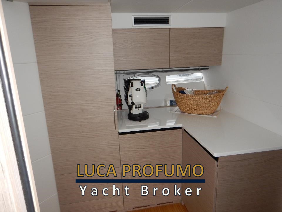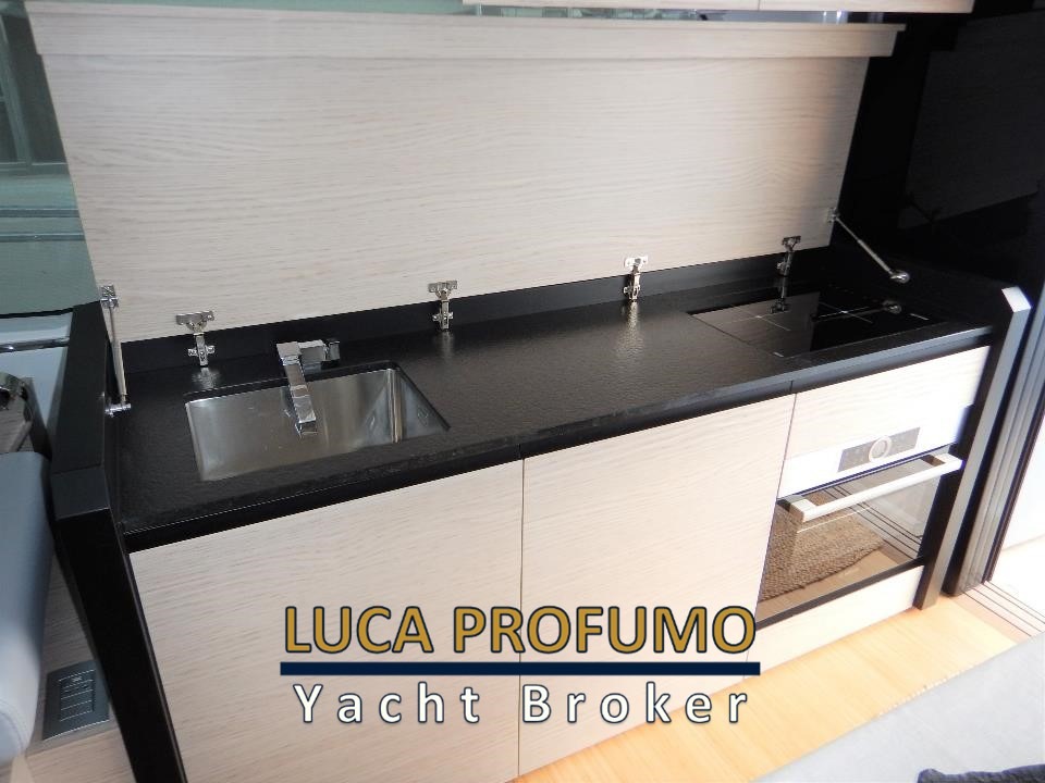 Cucina: piano cottura a due fuochi, aspiratore, lavello in acciaio, frigorifero, forno Bosch combinato, Frigo a cassetto sotto il divano. TV salone a scomparsa nel mobile cucina. Terzo frigo nel mobile lower deck. Ice maker.