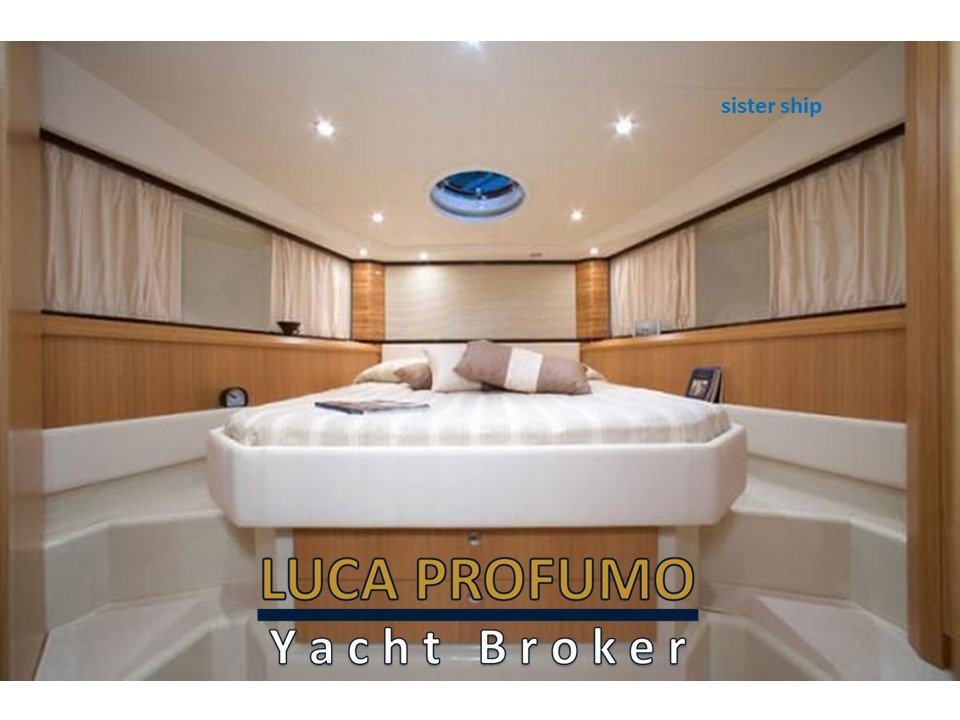 Cabina armatoriale a prua con bagno, Cabina VIP a centro barca con bagn0, Cabina ospiti letti incrociati a poppa con bagno, 1 Cabina equipaggio con bagno.